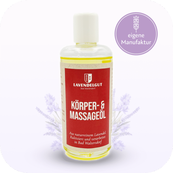 Wir stellen unsere Produkte selbst in unserer hauseigenen Manufaktur mit natürlichen Rohstoffen her. Der Lavendel für dieses pflegende Körper- und Massageöl stammt von unserem Feld in Bad Waltersdorf. Er wird von Hand gepflegt und geerntet. Garantiert 100%ige Natur.