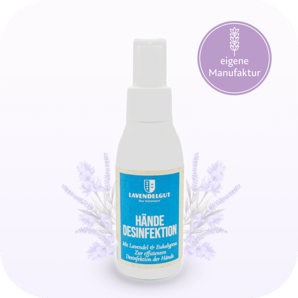 Unser Hand-Desinfektionsmittel duftet besonders wohltuend durch die Kombination der ätherischen Öle aus Lavendel, Eukalyptus und Rosmarin. Dieses einzigartige Desinfektionsmittel wird in unserer hauseigenen Kosmetikmanufaktur im Lavendelgut Bad Waltersdorf hergestellt.