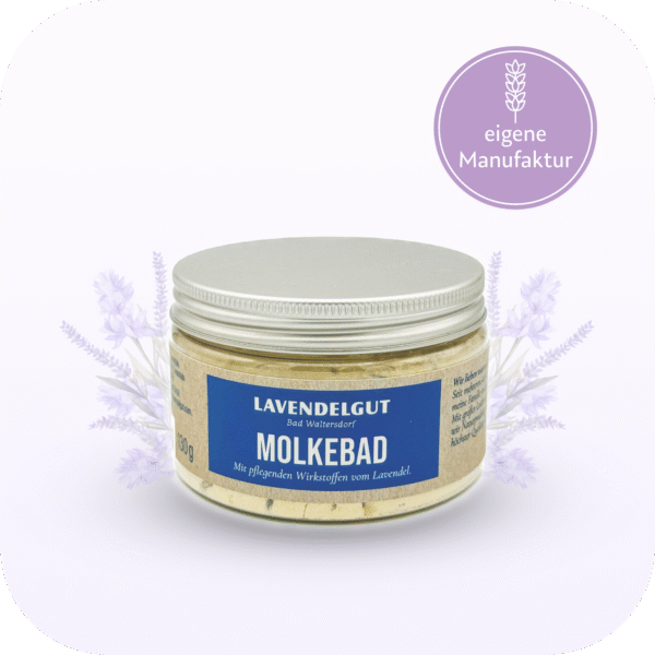 Wie ein Moment im Lavendelfeld! Unser Lavendel Molkebad zaubert streichelzarte Haut. Die pflegende Wirkung der Molke besteht darin, trockene und entzündete Haut zu regenerieren. Sogar bei Sonnenbrand ist das Lavendelgut – Molkebad bestens geeignet! Außerdem beruhigt und enspannt das darin enthaltene 100 % naturreine, ätherische Lavendelöl, um so für einen guten Schlaf zu sorgen.
