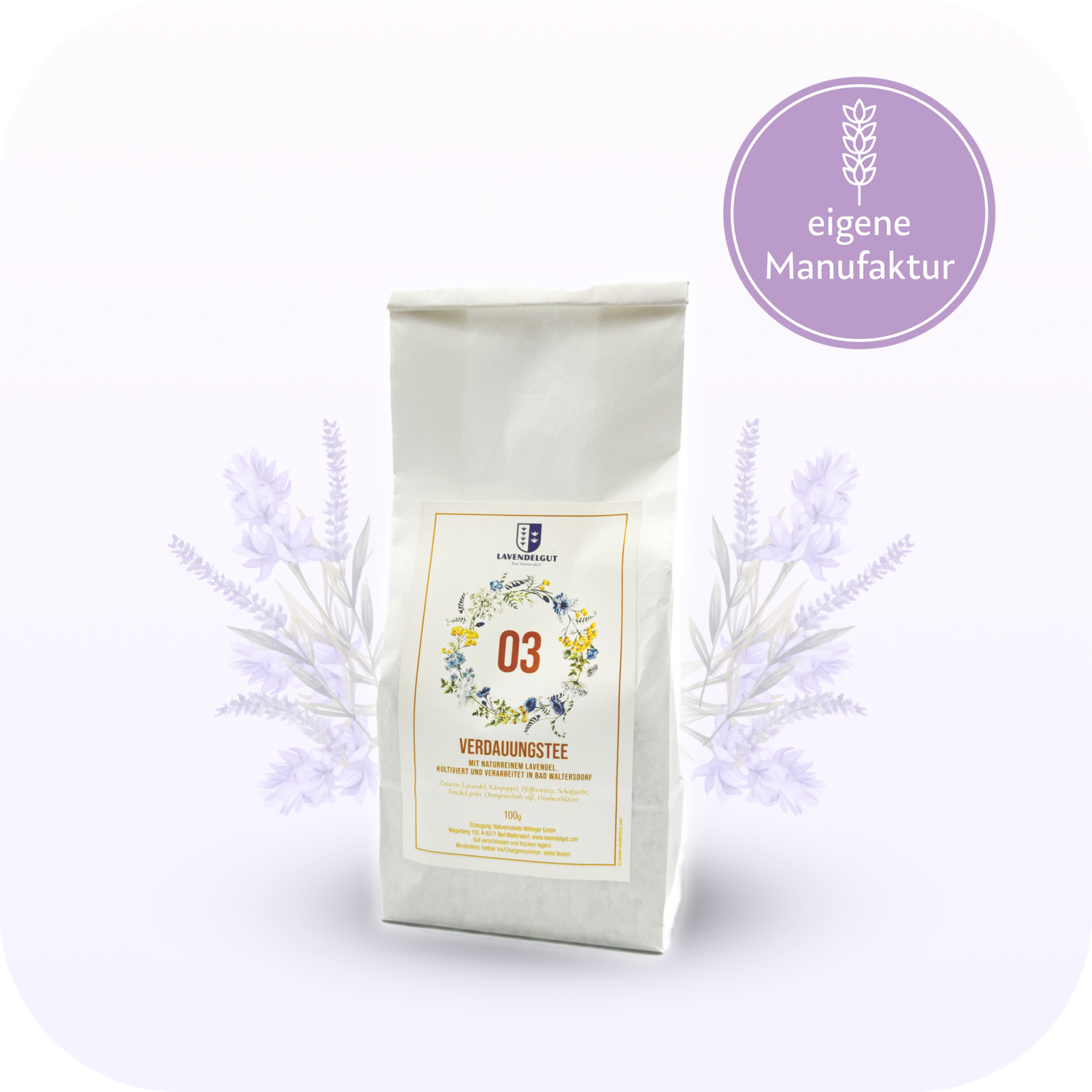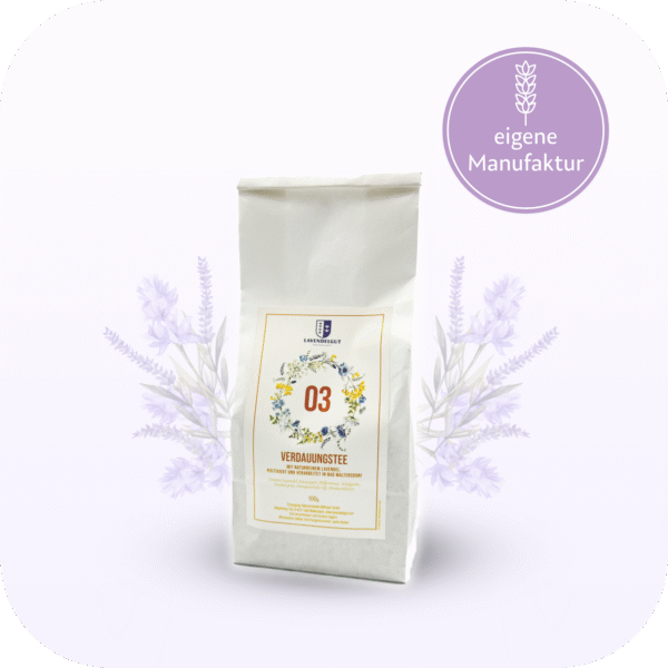 Der Lavendelgut Verdauungstee ist eine hochwertige Kräuterteemischung, die sanft und zuverlässig Verdauungsbeschwerden lindert. Die Schleimstoffe der Käsepappelblätter wirken reizlindernd und die Bitterstoffe der Orange helfen einer normalen Verdauung.